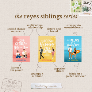 The Off-Chance of Me and You is a second-chance, ex-friends-to-lovers romance with a slow burn and a dash of spice. This is the first standalone novel in the Reyes Siblings series.